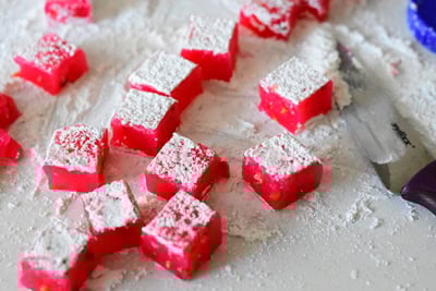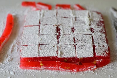Prendre un couteau (huiler au préalable afin de faciliter le découpage des loukoum) et découper des petits carrés.