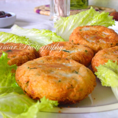 Il s’agit de galettes — ou plutôt de petites croquettes — à base de pommes de terre. On commence par cuire les pommes de terre à l’eau, puis on les écrase en purée avant d’y incorporer l’ail, le persil, les épices et un œuf qui vient lier l’ensemble.