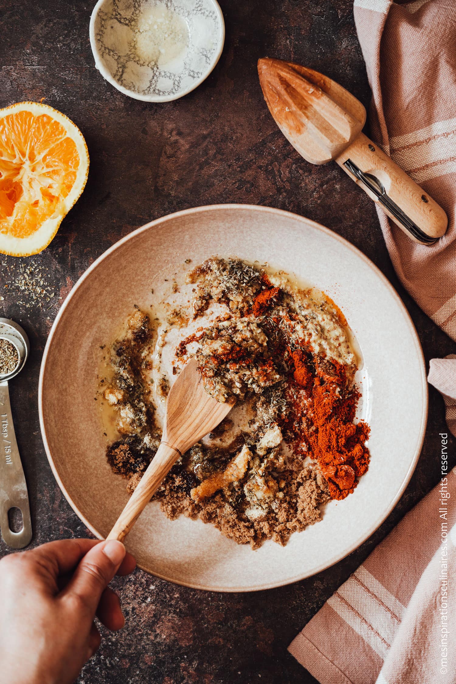 1. Pour commencer, dans un saladier profond, versez toutes les épices : paprika, ail en poudre, oignon en poudre, thym séché, l’origan séché, moutarde de Dijon, cassonade et sel.