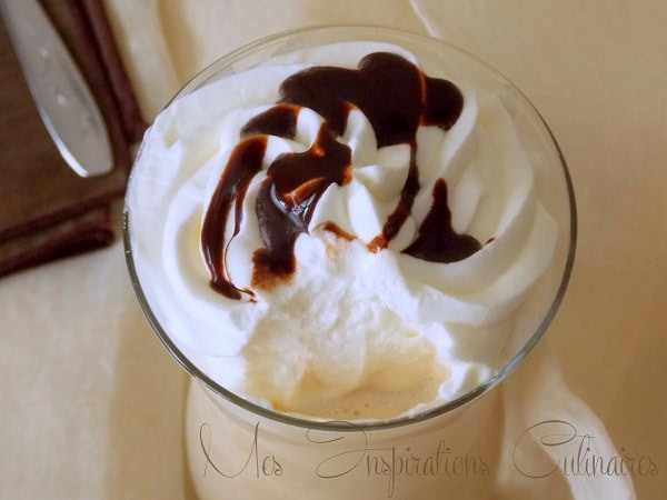 - Verser dans des verres, surmonter de chantilly et arroser de sirop de chocolat.