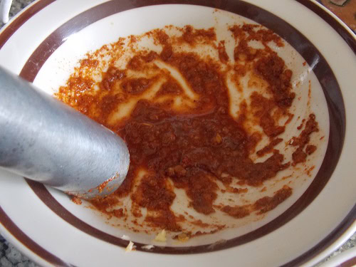 Piler la moitié de la tète d’ail avec le poivre rouge, une pincée de poivre, et le cumin (on appelle ça el-dersa). Ajouter 2 c-a-soupe d’eau.