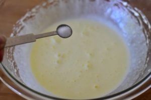 Dans un saladier, battre l’oeuf et le sucre jusqu’à une consistance mousseuse.
