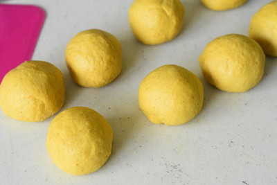 Dégazer la pâte et découpez 8 pâtons. Roulez en boule.