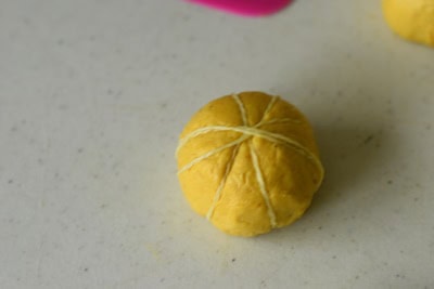 La ficelle doit être préalablement trempée dans de l’huile (huile d’olive pour moi) afin de la retirer facilement après cuisson et retirer l’excédent d’huile avant d’enrouler autour des pâtons.