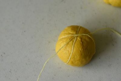 - Déposez la ficelle sur le plan de travail et disposez le pâton au centre. Croisez les deux bouts de la ficelle et retournez la pâte.