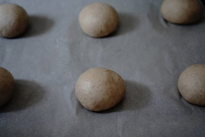 Une fois la pâte levée, divisez-la en 6 parts d’environ 60 gr. Formez les boules et déposez sur une plaque recouverte de papier sulfurisé.