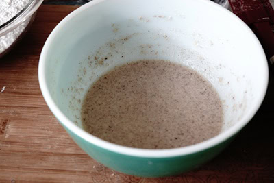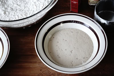- Dans un bol verser l'eau tiède et la levure sèche active. Mélanger et laisser mousser environ 10 minutes.