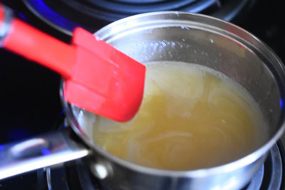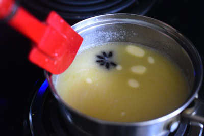 - Faire fondre le beurre à la casserole ou au micro-onde et l'ajouter au lait chaud.
