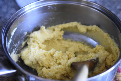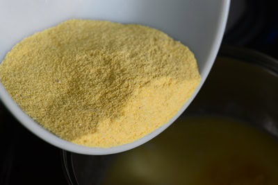 - Incorporer la farine de maïs ainsi que le sel et cuire tout en remuant pendant quelques minutes jusqu’à ce que la préparation épaississe. Laisser refroidir hors du feu.