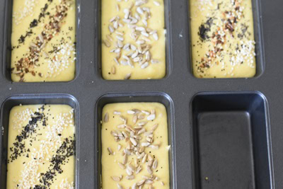- Beurrer des mini-moules à cake ( vous n'avez pas besoin de beurrer les empreintes en silicone), parsemer le fond des moules de graines afin de faciliter le démoulage.