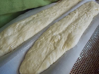 - J'utilise une plaque a baguette a pain que je recouvre de papier sulfurisé car ça colle vraiment. Déposer les deux baguette sur le papier sulfurisé. On peut saupoudrer de farine.