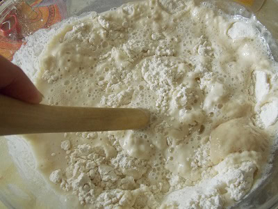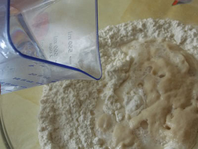 - Verser la levure ainsi que l'eau tiède et mélanger a l'aide d'un manche d'une cuillère en bois.