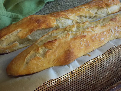 J’utilise une plaque perforée spéciale baguette à pain que je recouvre de papier sulfurisé car ça colle vraiment. Déposer les deux baguette sur le papier sulfurisé. On peut saupoudrer de farine.
