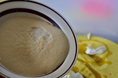 Pour le yaourt de préférence a température ambiante, le sel on le mélange avec la semoule il ne doit en aucun cas entrer en contact avec la levure qui doit être dissout dans un peu d’eau tiède (pas chaude) avec un peu de sucre on laissera mousser environ 15 minutes (si ça ne mousse ça cela signifie que l’eau est trop chaude).