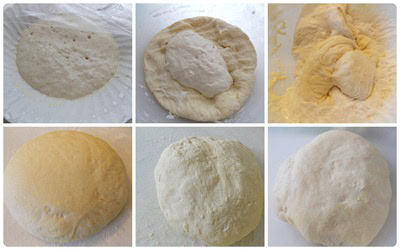 4. Pétrir la pâte (elle sera collante) durant 5 min, et la transverser sur le plan de travail farine, pétrir encore 5 bonnes