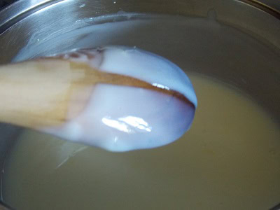 - Ajouter le mastic (pas mis) et le zeste de citron et remuer constamment afin que le lait n'attache pas au fond de la casserole (je rince à l'eau froide ma casserole sans la sécher avant de verser le lait).