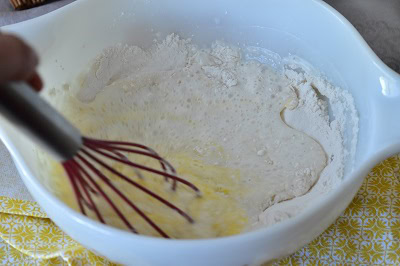 Mélanger bien le tout au fouet jusqu’à incorporation totale de la farine. La pâte doit être grumeleuse.