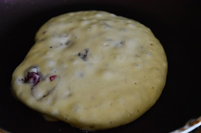 Huiler légèrement la surface de la poêle et verser 1/2 louche de la pâte.