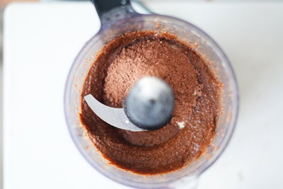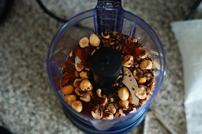 - Verser le reste des noisettes (150gr) et le sucre glace dans le robot et mixer jusqu’à obtenir une pâte.