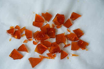 Verser le caramel sur un tapis silpat (ou comme moi du papier sulfurisé) en une fine couche. Puis, laisser durcir à température ambiante avant de casser en petits morceaux.