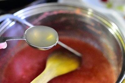 - Une fois que la pâte de fruit atteint 105 C (225 F ) diminuer le feu afin de maintenir la température durant 2- 3 minutes.