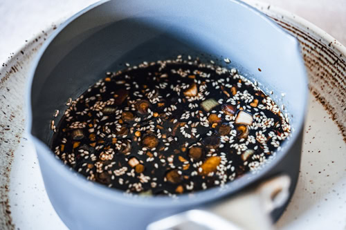 Parsemez avec l’oignon vert restant et 1 cuillère à soupe de graines de sésame.