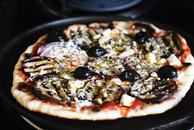 Pizza à la poêle, aubergines rôties et Feta