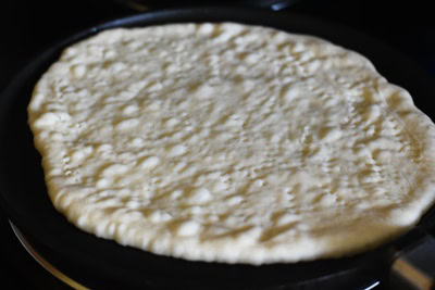 Déposez la pâte à pizza sur la poêle et la cuire environ 7 minutes a feu moyen.