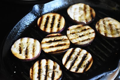 Pour commencer, coupez les rondelles d’aubergines, saler et poivrer et les griller (4 minutes de chaque côté) à la poêle en les arrosant d’huile d’olive Réserver.