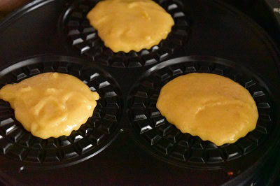 Chauffer la machine à Pizzelles (je règle la température à 3.5). Déposer une cuillère à café de la pâte sur chaque motif de plaque. Fermer l’appareil et laisser cuire 45 secondes environ (vérifier en ouvrant rapidement la plaque on doit obtenir une couleur dorée).
