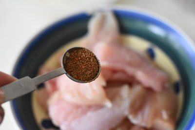 On voit souvent un enrobage à base de céréale, mais ce qui permet de créer une couche extérieure dorée et croustillante contrastant merveilleusement avec la tendreté de la viande c’est la marinade et la panure à base de farine.