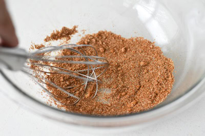 - Dans un saladier mélanger les épices (coriandre, paprika fume, poivre de Cayenne, oignon en poudre, ail en poudre, sel, poivre blanc et le sucre brun).