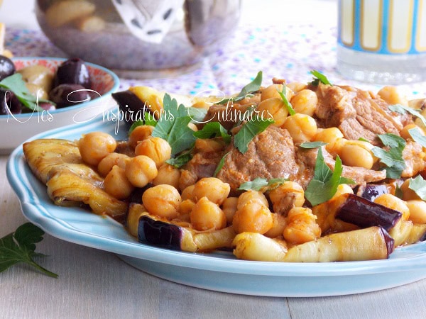 - Disposer les aubergines dans un plat mettre la viande et arroser de sauce et pois chiche.