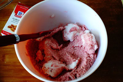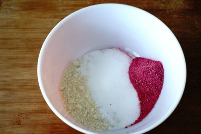 Dans un saladier, melanger ensemble la poudre d’amande, le sucre, le sel et les framboises lyophilisées.