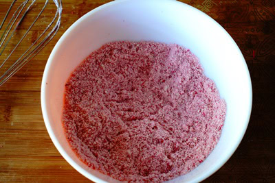 - Dans un saladier, mélanger ensemble la poudre d'amande, la farine et les framboises lyophilisées réduites en poudre.