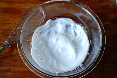 - Battre les blancs en neige avec la pincée de sel. Ajouter progressivement le sucre et battre jusqu’à obtenir une meringue lisse et brillante.