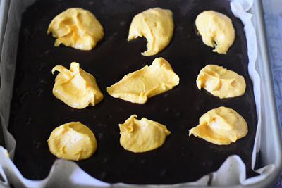 Déposez des petits tas de pate à citrouille sur la pâte à brownie à l’aide d’une cuillère. Puis en vous aidant d’une lame de couteau ou encore d’un cure-dent réalisez des formes spirales.