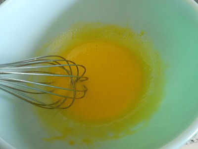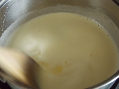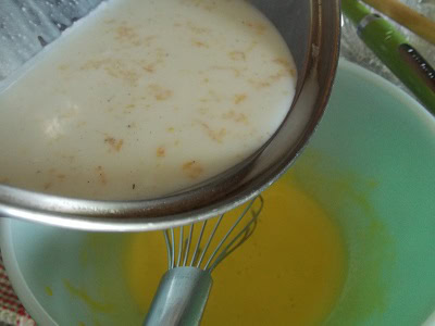 - Quand le lait est chaud le verser doucement sur les jaunes d'oeufs tout en melangeant (ne pas fouetter sinon on fait mousser la preparation et aussi on veut eviter de cuire les jaunes d'oeufs).
