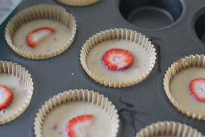 Incorporer les fraises en petits morceaux et verser dans des caissettes remplies à moitié.