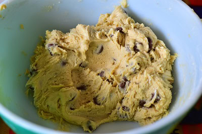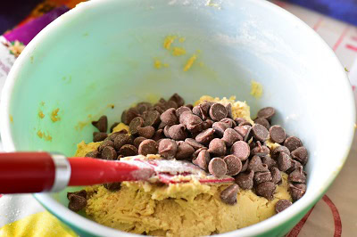 - Verser ensuite le lait et incorporer les pépites de chocolat en malaxant la pâte.
