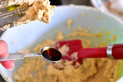 Dans un saladier fouetter au batteur le beurre et le sucre roux jusqu’à consistance crémeuse. Ajouter l’oeuf et battre quelques minutes en ajoutant la vanille liquide.