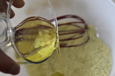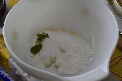 - Commencer par mélanger la farine, poudre d'amande, sucre et thé matcha.