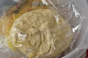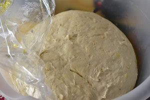- La couvrir de nouveau avec un film alimentaire huile et laisser lever de nouveau dans un endroit chaud environ 35-40 minutes ou jusqu’à ce qu'elle double de volume.