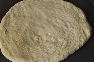 - Après le repos de la pâte, la déposer sur plaque ronde ou rectangulaire et étaler avec les doigts jusqu’à ce qu'elle soit fine.
