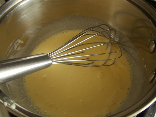 Verser la crème liquide, les jaunes d’oeuf, le sucre, la gousse de vanille fendue (j’ai utilisé du sucre vanillé) en deux dans une casserole et chauffer feu doux.