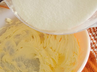 Battre le beurre en crème. Ajouter le sucre et continuer à battre jusqu’à obtenir un aspect crémeux et une couleur pale.