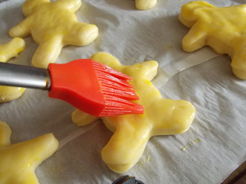 - Dégazer la pâte et l’étaler, a l'aide de emporte pièce découper des bonhommes ou alors si vus ne possédez pas d’emporte-pièce faire des petites boules, former des boudins et a l'aide d'une paire de ciseaux former les mains et les pieds.