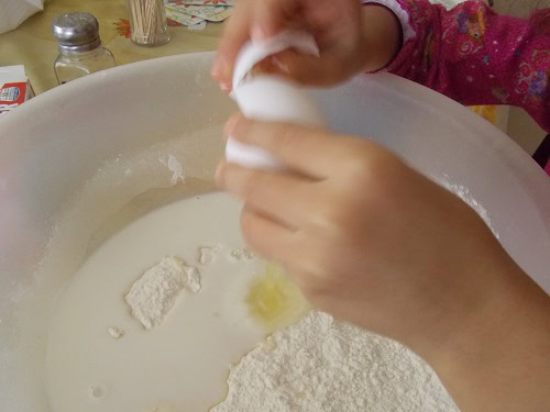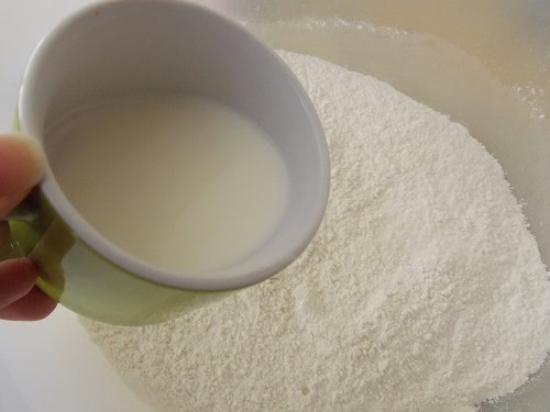 - Ajouter le lait tiède ainsi que les oeufs légèrement battu.