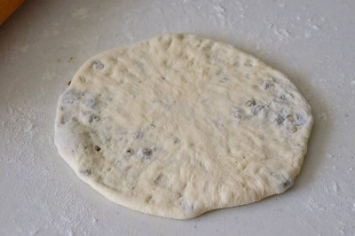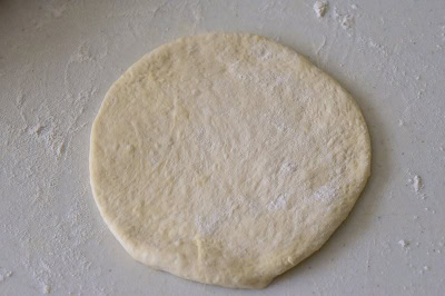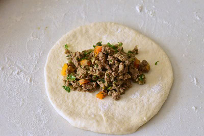 - Prendre une boule, fariner le plan de travail et aplatir la pâte. Déposer une cuillère à soupe de farce au centre et refermer en boule comme sur la photo. Aplatir une seconde fois avec la main et étaler au rouleau délicatement.