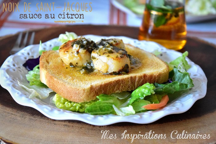 Disposer les tranche de pain grillée sur une assiette. Déposer 3 noix de saint-Jacques sur chaque tranche et arroser de sauce au citron.